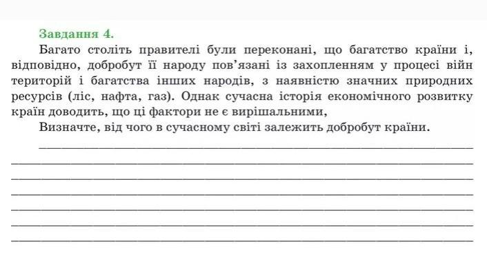 Завдання 4. Багато століть правителі були переконані, що багатство країни і, iдповiдно, добробут її народу пов'язанi iз захопленням у процесі війн ериторій і багатства інших народів, з наявністю значних природних есурсів (ліс, нафта, газ). Однак сучасна історія економічного розвитку раїн доводить, що ці фактори не є вирішальними, Визначте, від чого в сучасному світі залежить добробут країни.