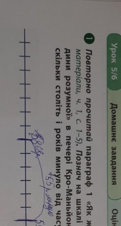 1Повторно прочитай параграф 1 Як жили люди в первiснi часи» (див. навчальнi матеріали, ч. 1, с. 1-5). Познач на шкалi (стрічці) часу рік виявлення решток лю- дини розумної» в печерi Кро-Маньйон на території сучасної Франції. Обчисли, скільки століть і років минуло від часу цiєї знахідки до сьогодення.