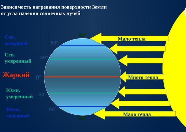 Кількість сонячного тепла залежить від географічної широти і від кута падіння сонячних променів.