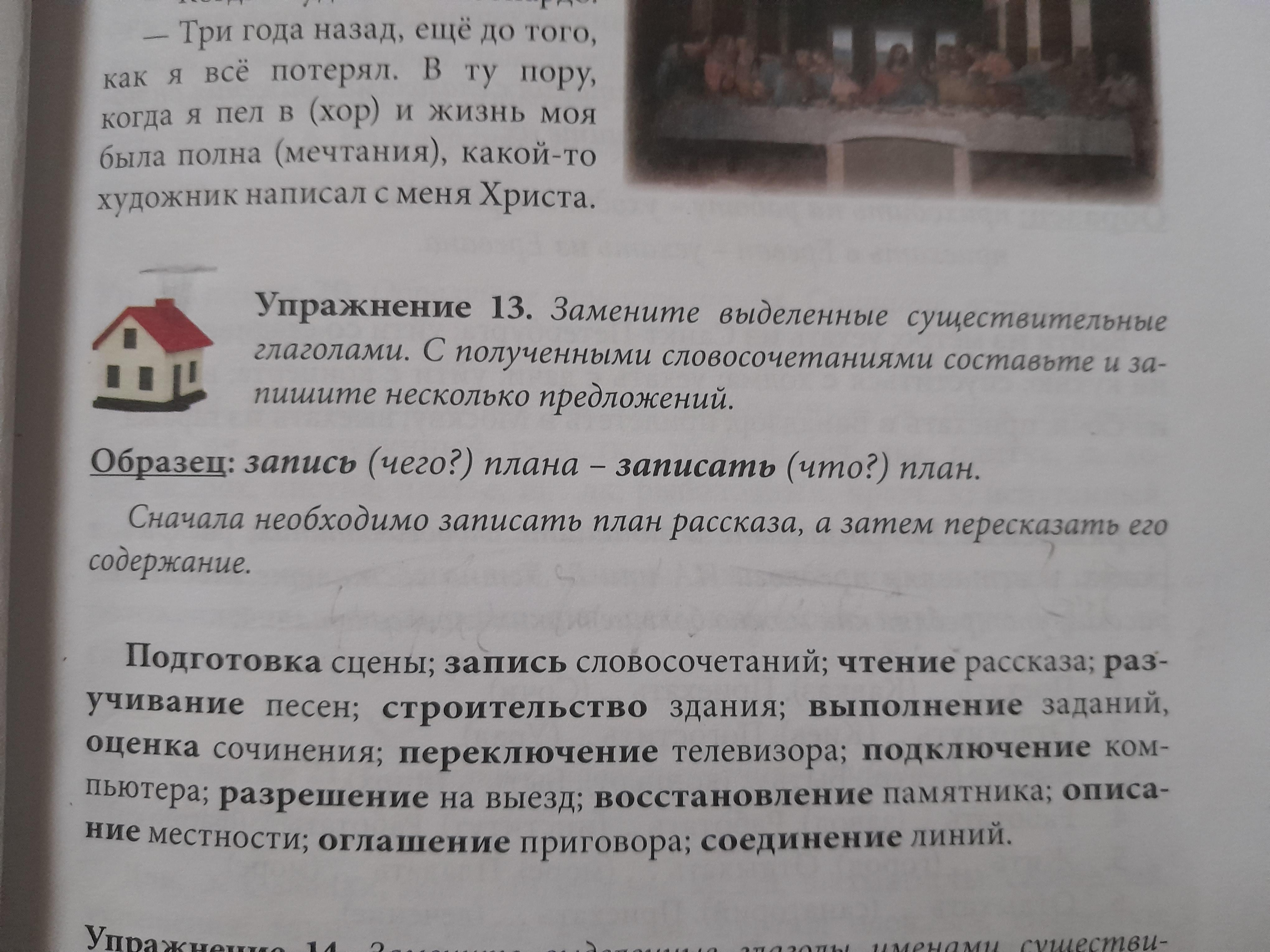 Подготовка (чего?) сцены - подготовить (что?) сцену; запись (чего?)словосочетаний - записать (что?) словосочетания; чтение (чего?)рассказа - читать (что?) рассказ; разучивание(чего?) песен - разучивать (что?)песни; строительство(чего?) здания - строить(что?) здания; выполнение(чего?) заданий - выполнять(что?) задания, оценка(чего?) сочинения - оценивать (что?)сочинения; переключение(чего?) телевизора - переключать(что?) телевизор; подключение(чего?) компьютера - подключать(что?) компьютер; разрешение(чего?) на выезд - разрешать(что?) выезд; восстановление(чего?) памятника - восстановлять(что?) памятник; описание(чего?) местности - описывать (что?)местность; оглашение (чего?)приговора - оглашать (что?)приговор; соединение(чего?) линий - соединять (что?)линии.