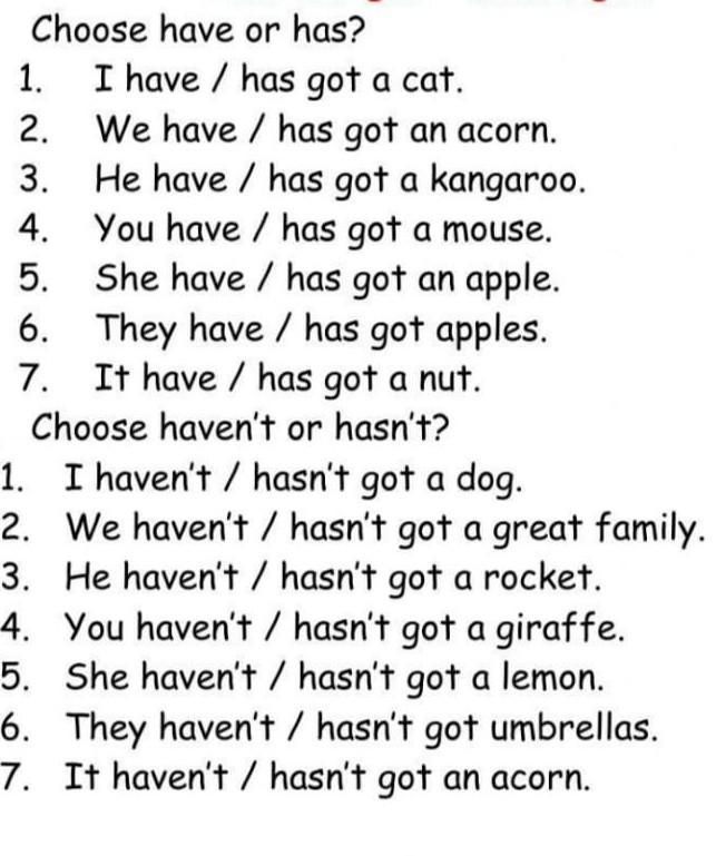 1. Choose have or has? 1. 2. 3. 4. 5. 6. 7. I have has got a cat. We have / has got an acorn. He have / has got a kangaroo. You have / has got a mouse. She have / has got an apple. They have / has got apples. It have / has got a nut.