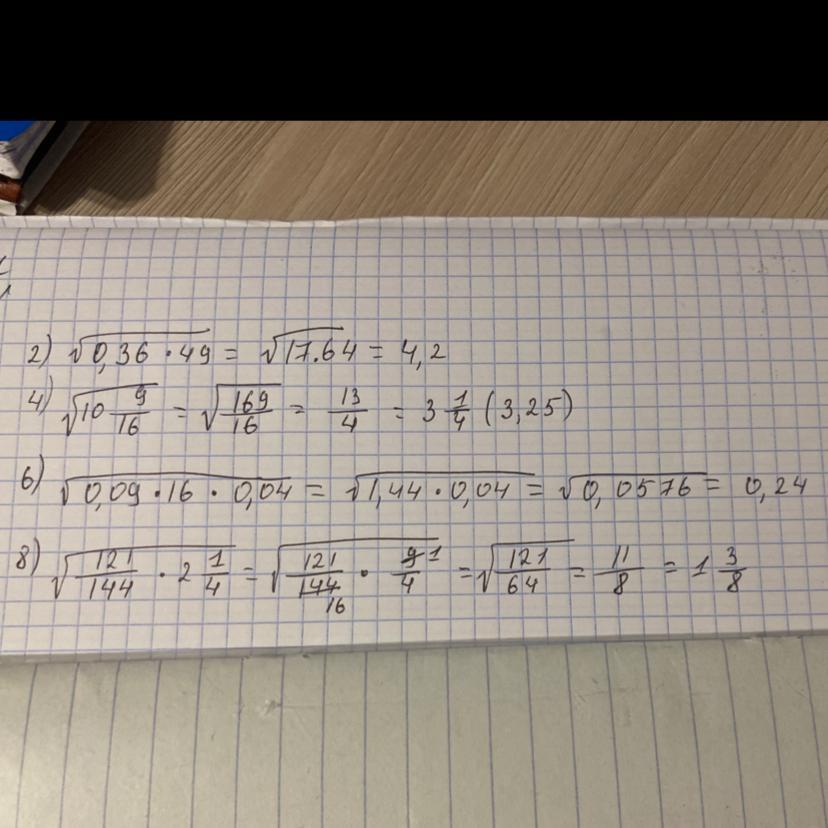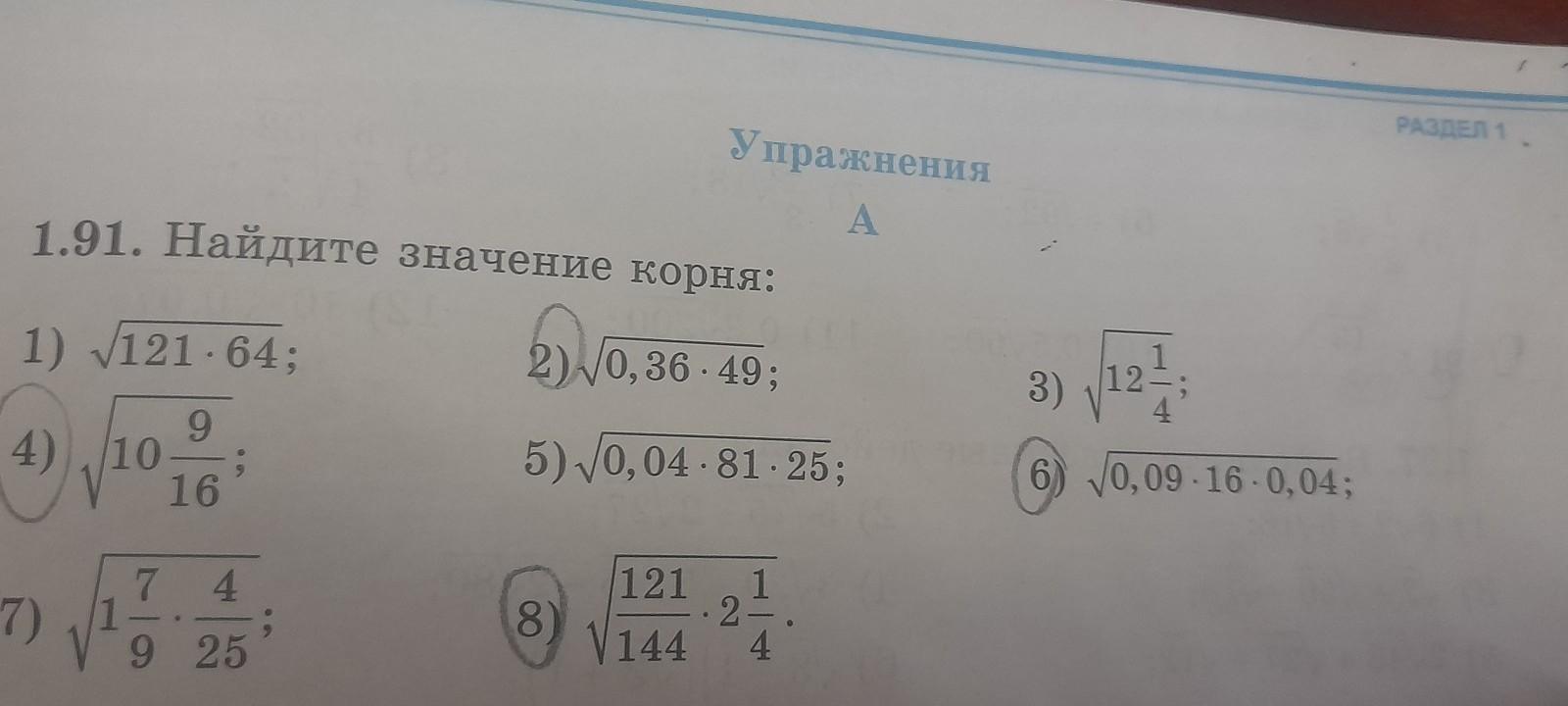1.91. Найдите значение корня: 2) 0,36 - 49 ; 5) √0,04-81-25; 1) √121.64; 9 16 4) 10 7) 7 4 9 25 8 121 √144 4 D 3) 12. 6) √0,09-16 0,04;