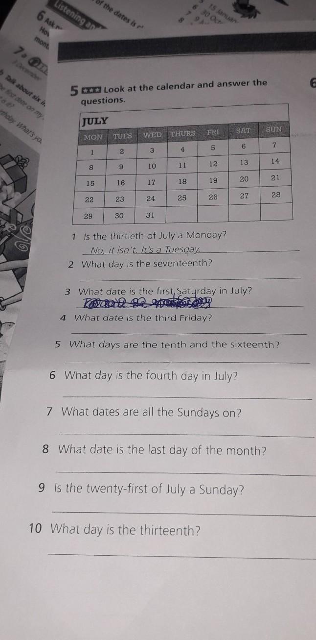 5 Look at the calendar and answer the questions. JULY MON 16 22 29 9 30 3 10 17 31 11 18 25 S 12 19 26 1 Is the thirtieth of July a Monday? No. it isn't It's a Tuesday 2 What day is the seventeenth? What date is the third Friday? 3 What date is the first, Saturday in July? 6 What day is the fourth day in July? 0 What day is the thirteenth? 13 7 What dates are all the Sundays on? 20 27 SUN 5 What days are the tenth and the sixteenth? 8 What date is the last day of the month? 9 Is the twenty-first of July a Sunday? 7 21 3 помогите пж 900 балов даю
