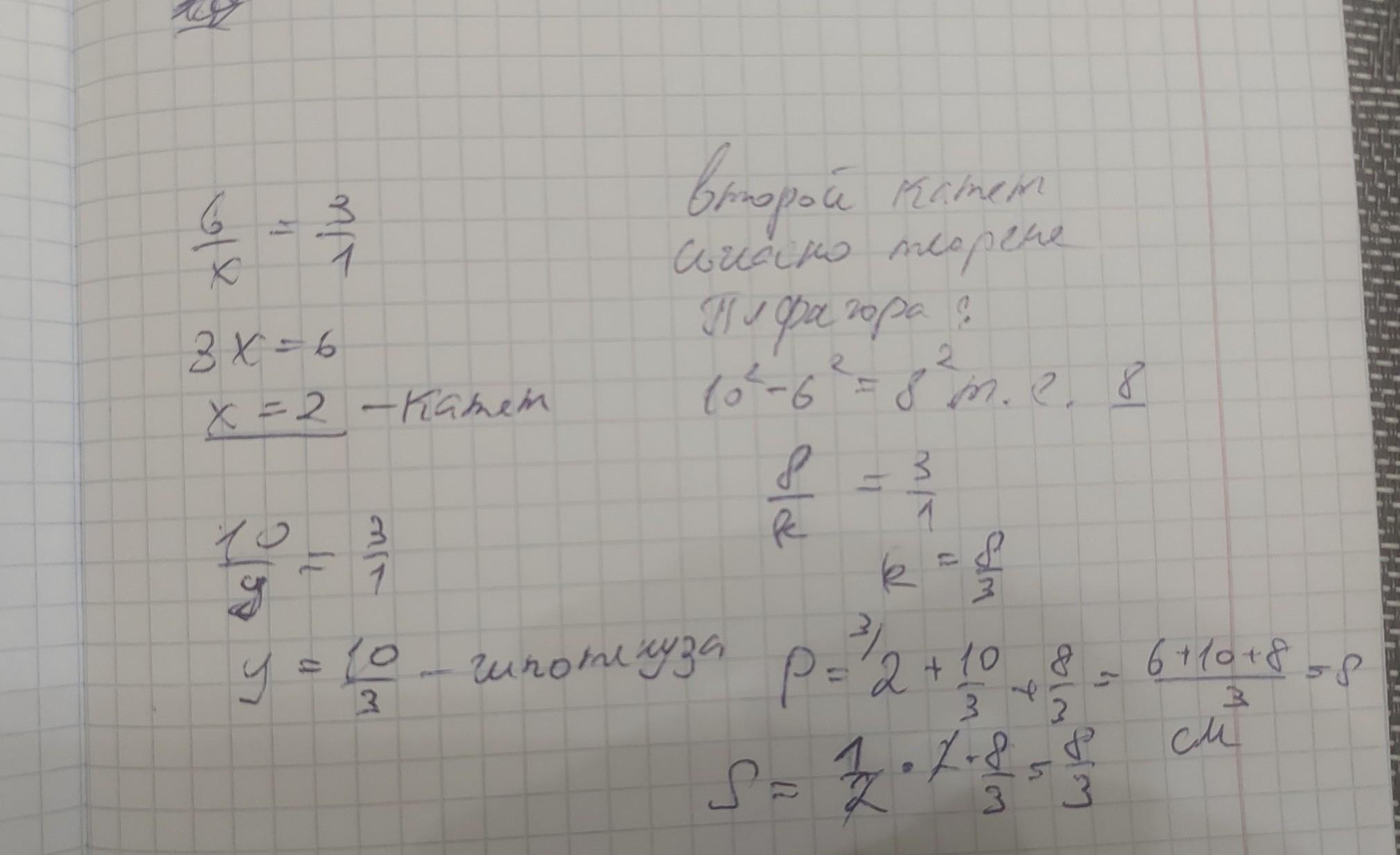 Один катет прямоугольного треугольника равен 6 см, а гипотенуза 10 см. Существует еще один подобный этому треугольнику прямоугольный треугольник, стороны которого короче сторон данного треугольника. Вычислите периметр и площадь подобного треугольника, если коэффициент подобия равен 1/3.