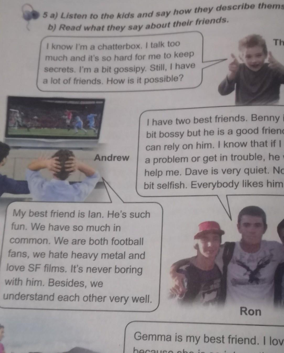 Потрібно написати 2 своїх приклада з класу як зображено на фотографії. Але це має бути про друзів і з використання слів chatterbox, gossip, computer wizard, vegetarian, couch potato, close friend, health freak, football fan