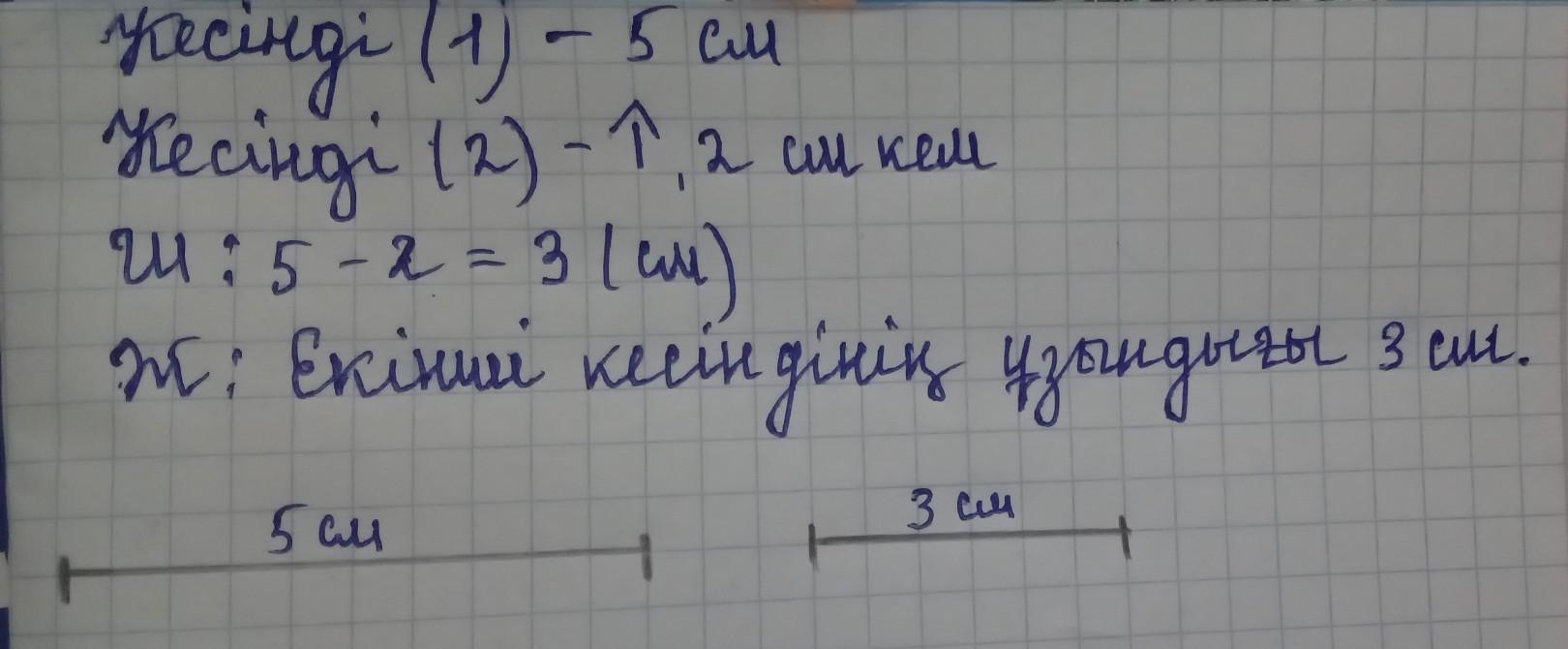 6. Есепті шығар. Бiрiншi кесіндінің ұзындығы 5 см, ал екінші кесіндінің ұзындығы одан 2 см кем. Екінші кесін- дiнiн ұзындығы кандай? Осы кесінділерді сыз.