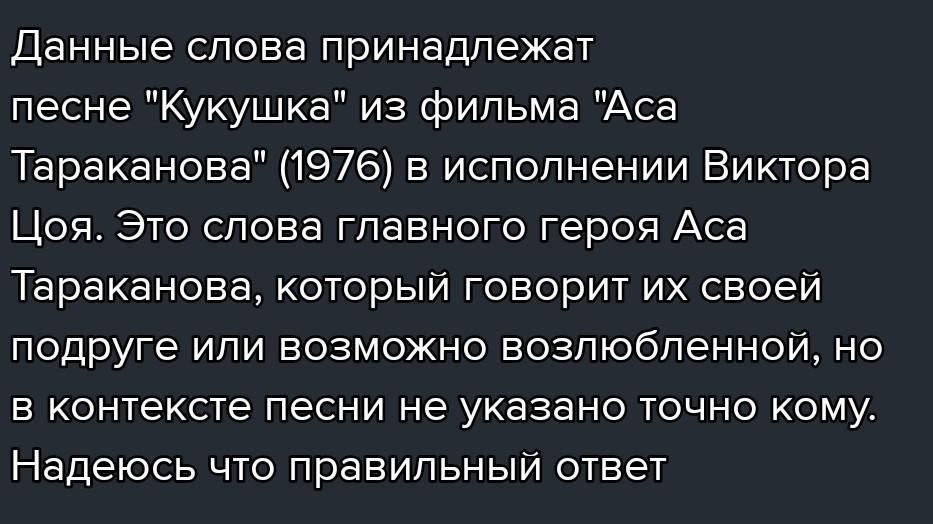 Данные слова принадлежат песне "Кукушка" из фильма "Аса Тараканова" (1976) в исполнении Виктора Цоя. Это слова главного героя Аса Тараканова, который говорит их своей подруге или возможно возлюбленной, но в контексте песни не указано точно кому.