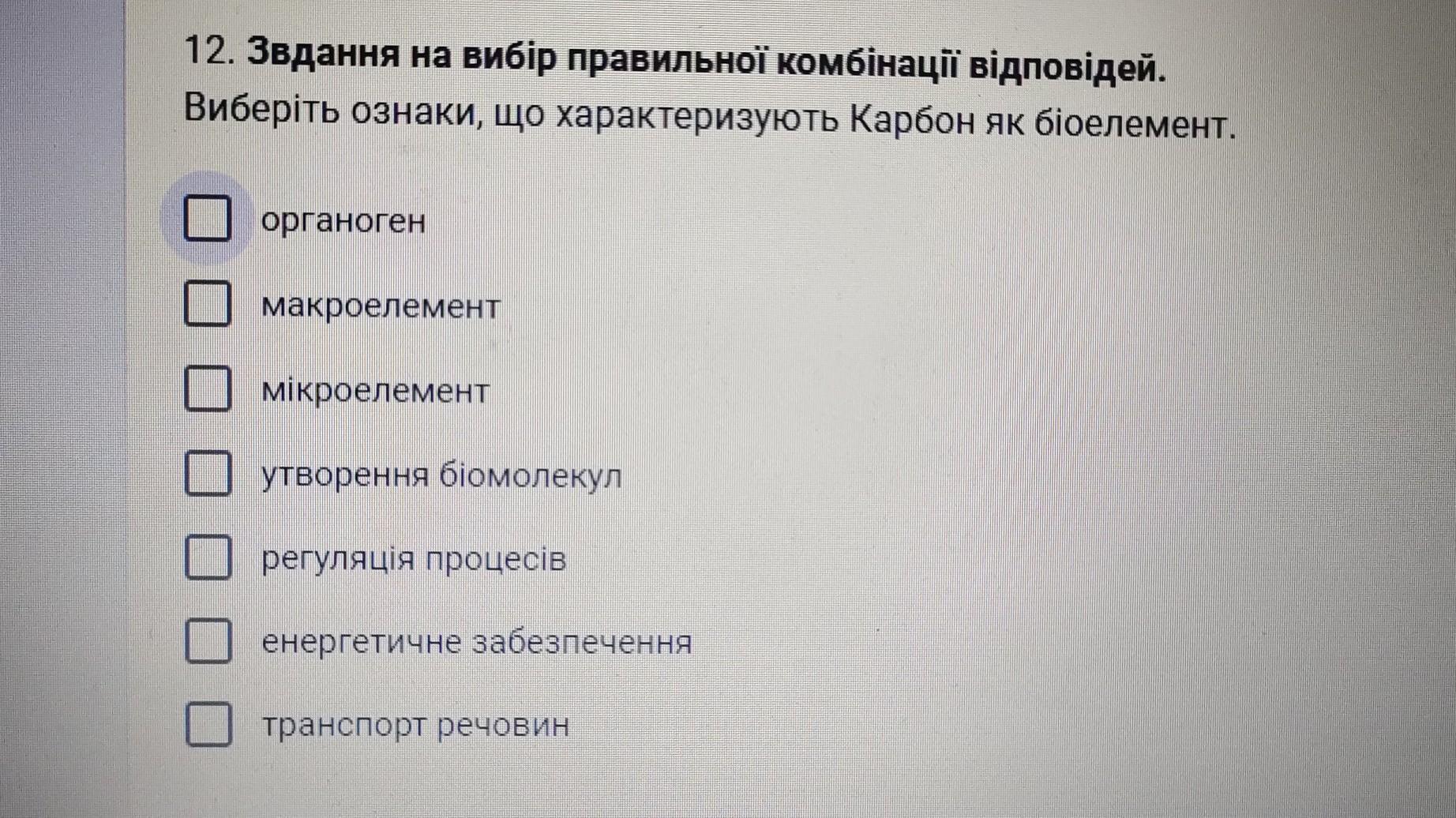 12. Звдання на вибір правильної комбінації відповідей. Виберіть ознаки, що характеризують Карбон як біоелемент. органоген макроелемент мікроелемент утворення біомолекул регуляцiя процесів енергетичне забезпечення транспорт речовин