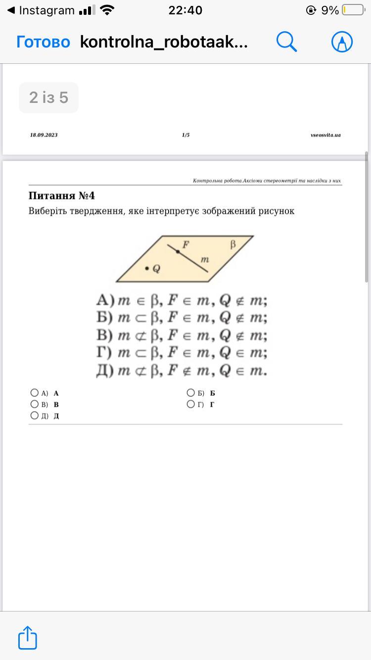 m Не перетинається з В, Ф належить до м, а Q не належить м