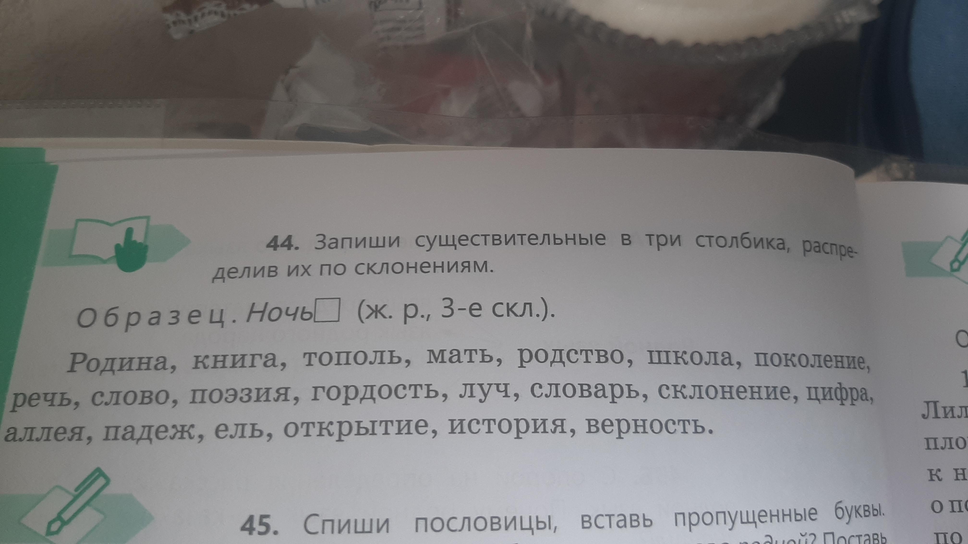 Помогите пожалуйста с задание Записать существительные в три столбика распределив их по склонениям (образец на фотке)