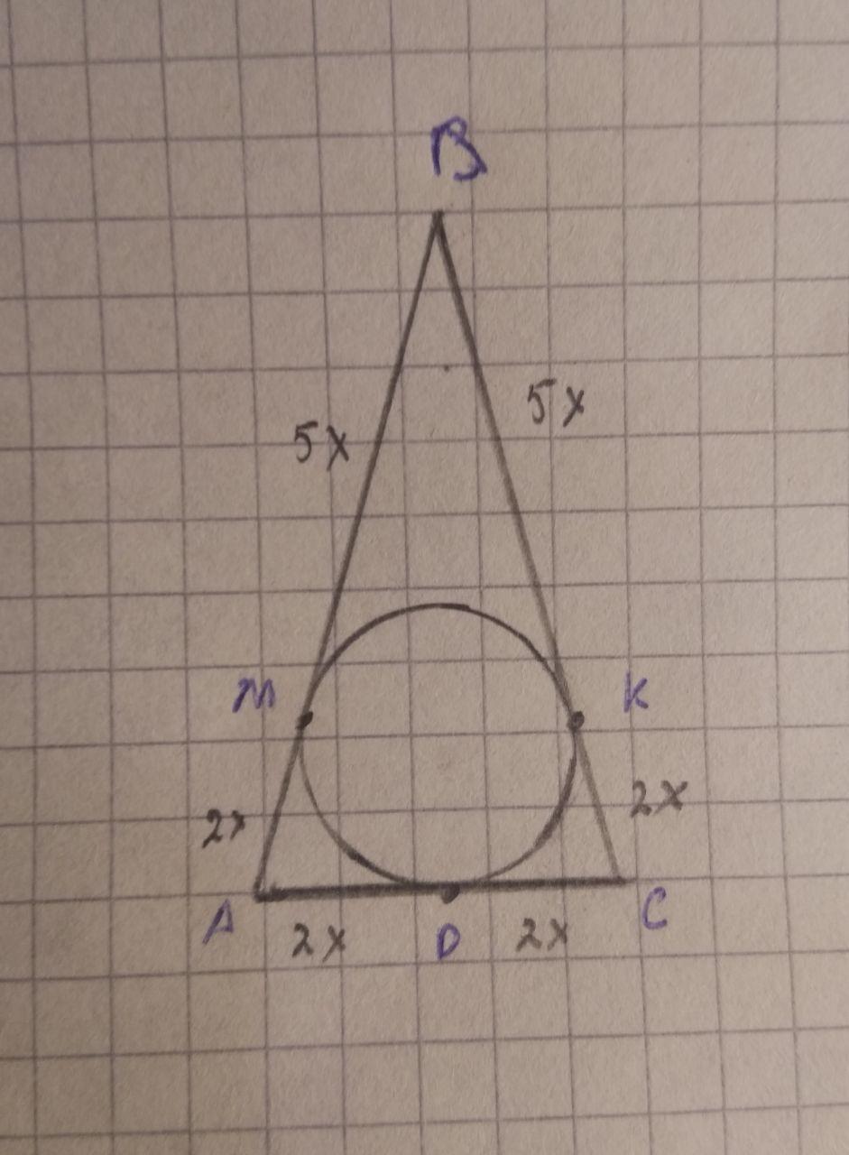 Бічна сторона рівнобедреного трикутника ділиться точкою дотику вписаного кола у відношенні 5:2, рахуючи від вершини кута при основі трикутника. Знайдіть сторони трикутника, якщо його периметр дорівнює 72 см.