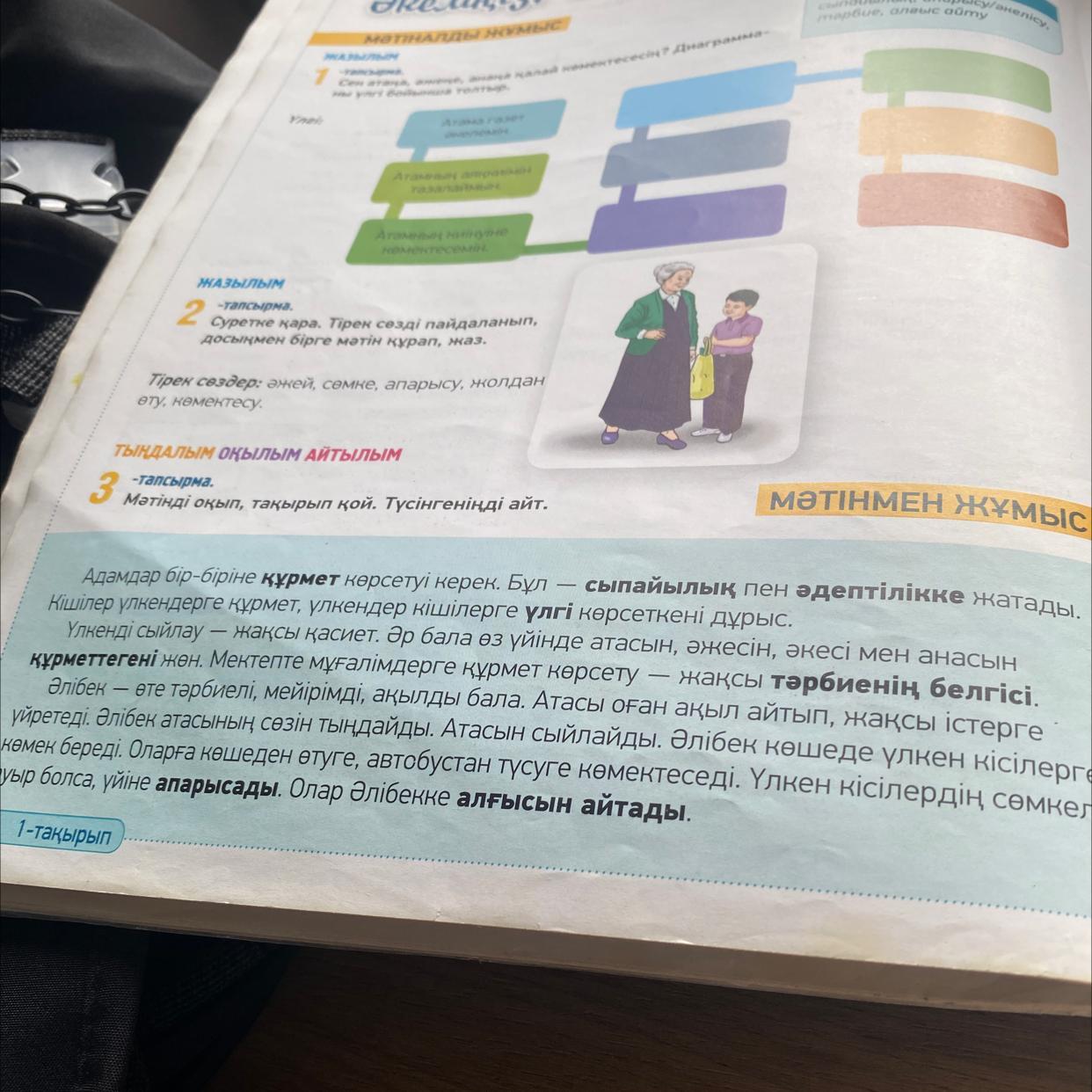үйретеді. Әлібек атасының сөзін тыңдайды. Атасын сыйлайды. Әлібек көшеде үлкен кісілерге