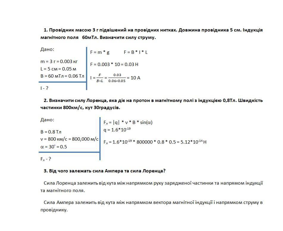 1)Провідник масою 3 г підвішений на провідних нитках. Довжина провідника 5 см. Індукція магнітного поля 60мТл. Визначити силу струму.