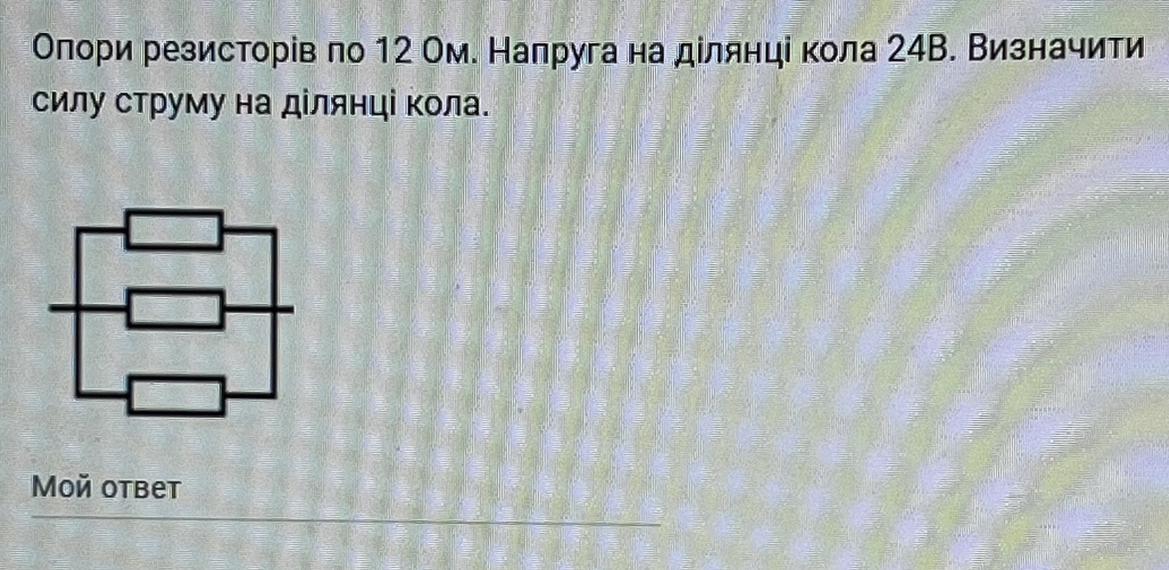 Допоможіть! Опори резисторів по 12 Ом. Напруга на ділянці кола 24В. Визначити силу струму на ділянці кола.