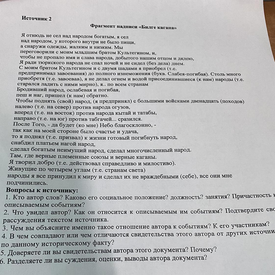 1. Автор слов в данном фрагменте источника не уточняется, но текст представляет собой монументальную надпись, которую, возможно, создавал или заказывал высший правитель, вероятно, каган (лидер тюркских племен), для описания своих действий и достижений. Его социальное положение можно оценить как верховное, ибо он утверждает свое право на правление и описание важных событий в истории народа.