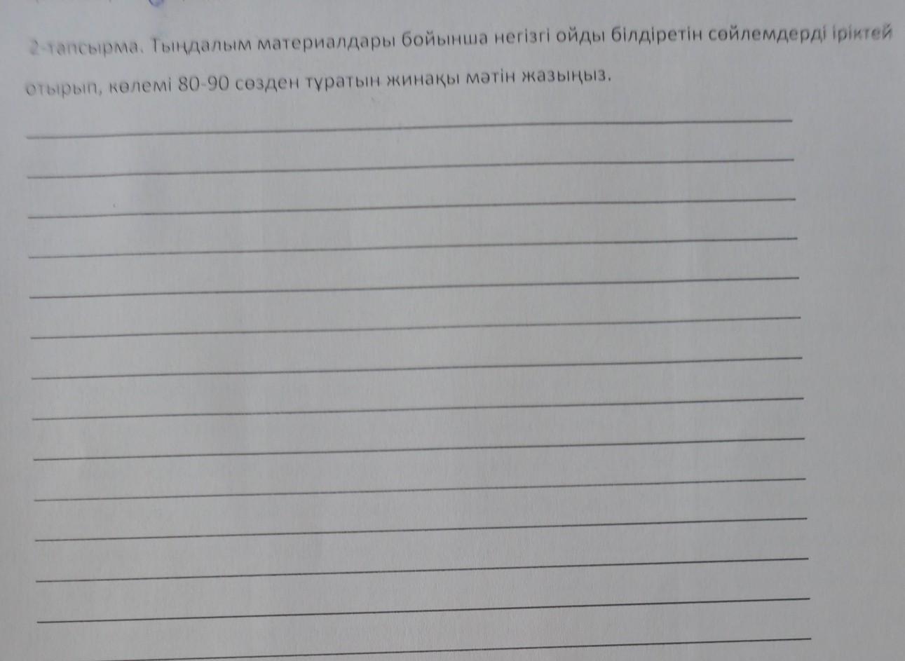 2-тапсырма. Тыңдалым материалдары бойынша негізгі ойды білдіретін сөйлемдерді іріктей отырып, көлемі 80-90 сөзден тұратын жинақы мәтін жазыңыз.ПОМОГИТЕ