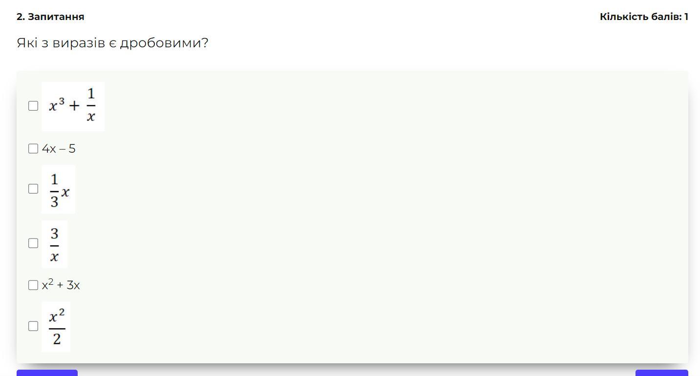 Відповідь: 4х-5 х2+3х цілі ; остальные дробові