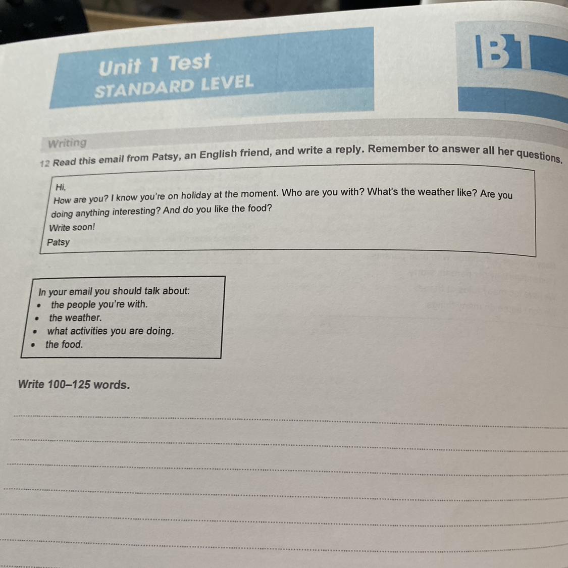12 Read this email from Patsy, an English friend, and write a reply. Remember to answer all her questions.