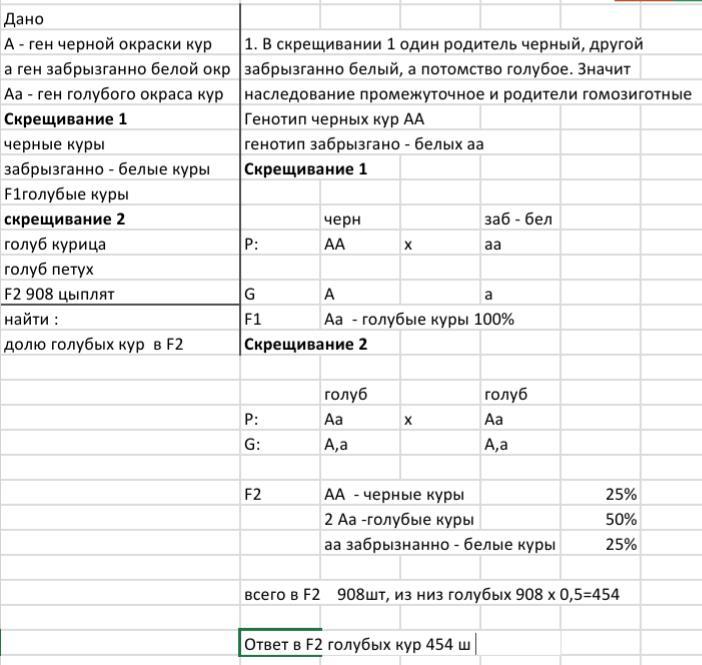 значит, т.к. Аа это голубые, то число голубых кур во втором поколении составит ровно половину от того числа, которое удастся получить при скрещивании. т.е. 908/2= 454.