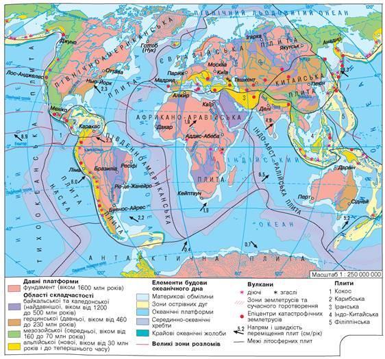 - На платформі розташовані такі форми рельєфу, як рівнини, височини, низовини таплато.В складчастій області розташовані гори, нагір'я, хребти, міжгірні улоговини.