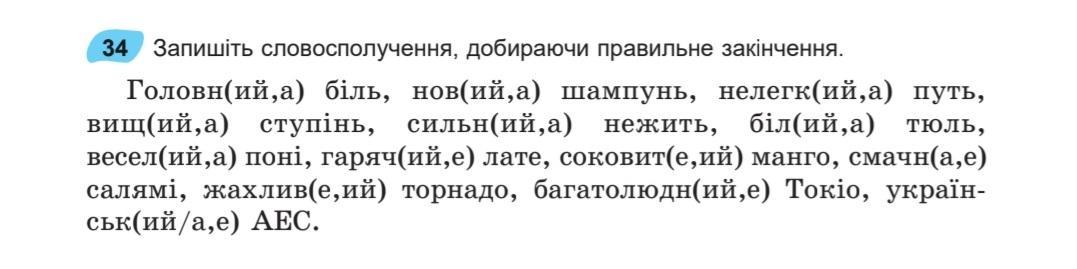 Головний біль, новий шампунь, нелегкий путь, вищий ступінь, сильний нежить, біла тюль, веселий поні, гарячий лате, соковитий манго, смачне салямі, жахливий торнадо, багатолюдний Токіо, українська АЕС