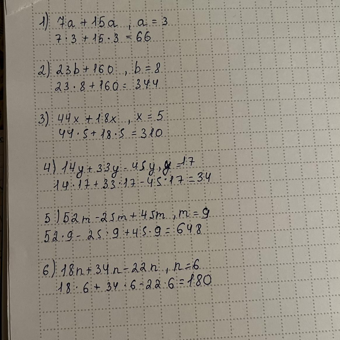 98. Упростите выражение и найдите его значение: 1) 7а + 15а при а = 3; 2) 23b + 160 при b = 8; 3) 44x 18х при х = 5; 4) 14y + 33у - 45у при у = 17; 5) 52m - 25m + 45m при м = 9; 6) 18n + 34n - 22n при n = 6