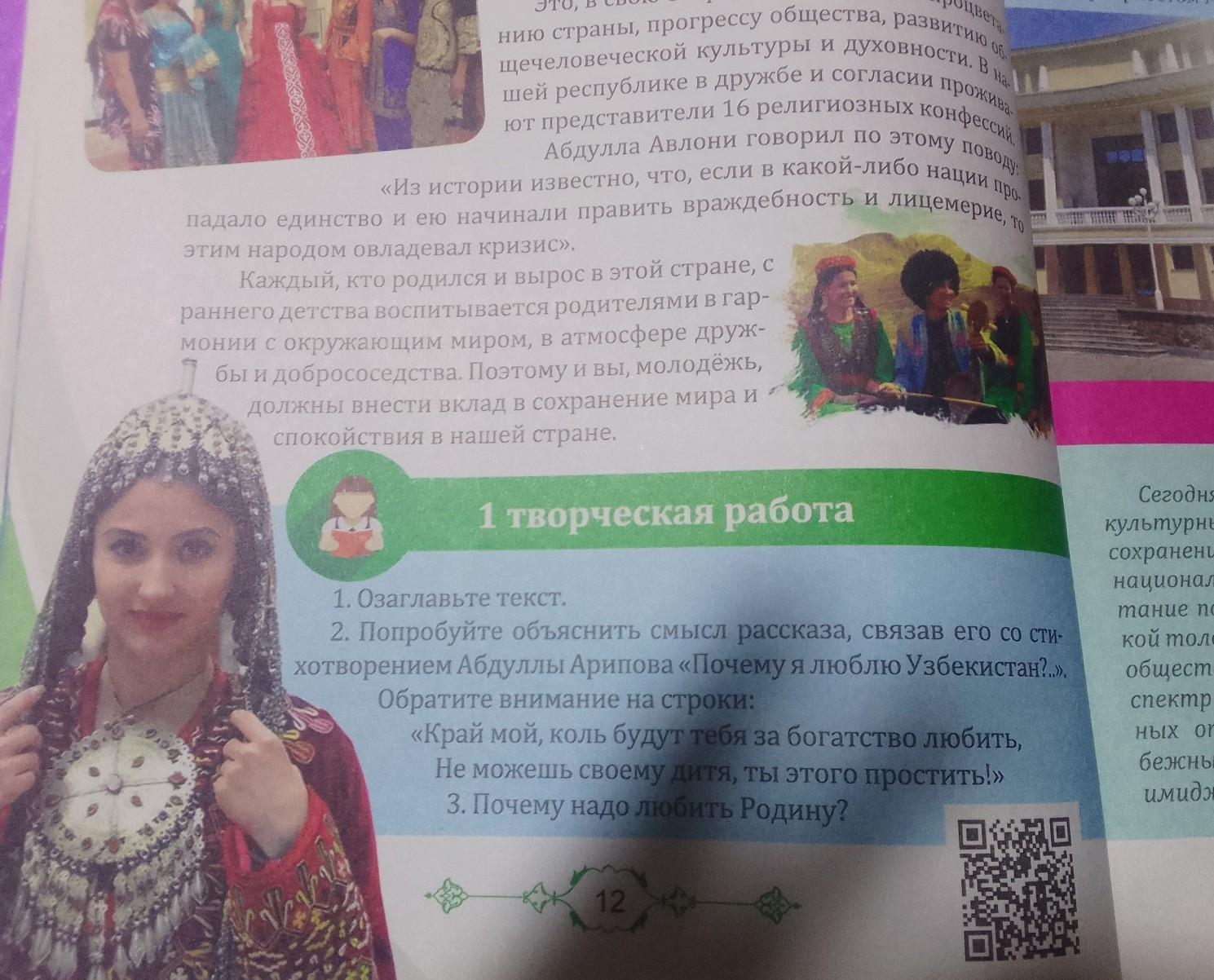 1 творческая работа 1. Озаглавьте текст. 2. Попробуйте объяснить смысл рассказа, связав его со сти- -отворением Абдуллы Арипова «Почему я люблю Узбекистан?... Обратите внимание на строки: «Край мой, коль будут тебя за богатство любить, Не можешь своему дитя, ты этого простить!» 3. Почему надо любить Родину? 0 20