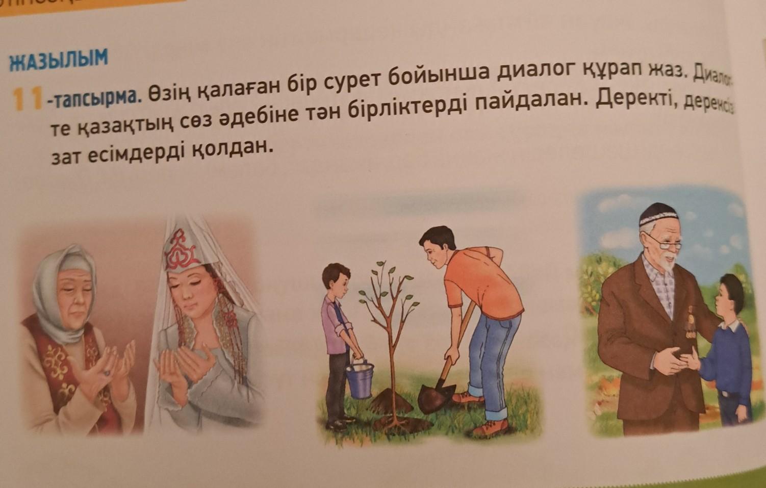 ЖАЗЫЛЫМ 11-тапсырма. Өзің қалаған бір сурет бойынша диалог курап жаз. Д те қазақтың сез адебіне тан бiрлiктердi пайдалан. Деректі зат есімдерді колдан. ДАМ 100 БАЛОВ