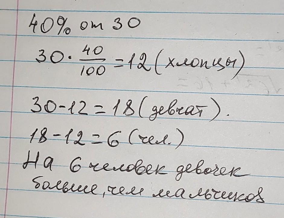 У класі 30 учнів, 40% з яких хлопці. Кого у класі більше: хлопців чи дівчат? На скільки? другим способом будь ласка