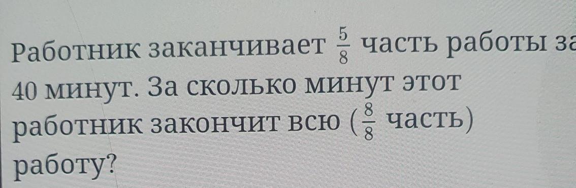решение будет: 5/8 * x = 8/8 * 40 → 5/8x = 40 → x = 40 * 8/5 → x = 64 минут