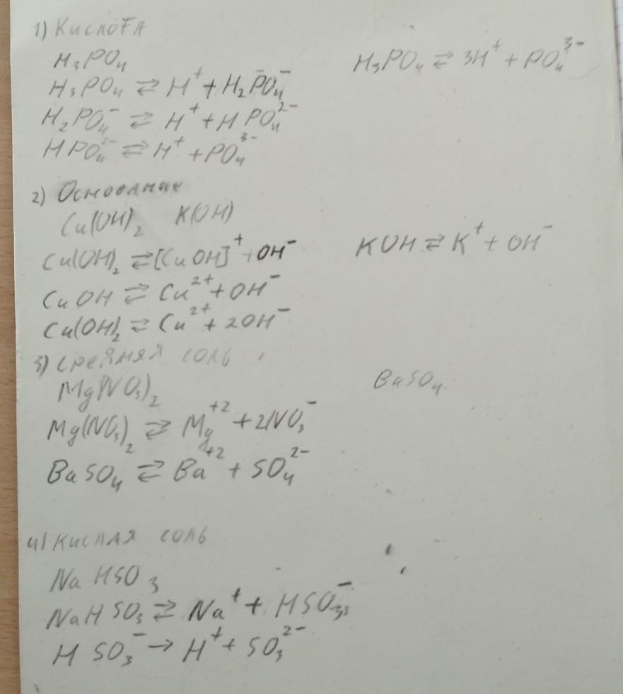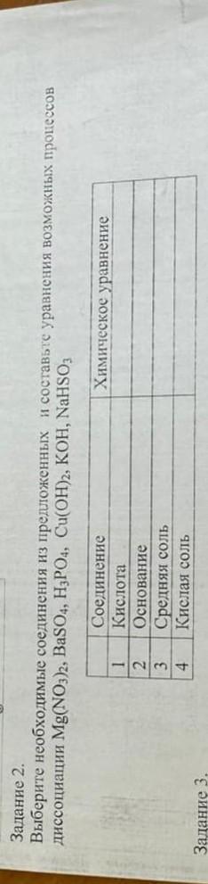 Задание 2. Выберите необходимые диссоциации Mg(NO3)2, Задание 1 2 3 4 соединения из предложенных BaSO4, H3PO4, Cu(OH)2, KOH, NaHSO3 Соединение Кислота Основание Средняя соль Кислая соль и составьте уравнения возможных процессов Химическое уравнение