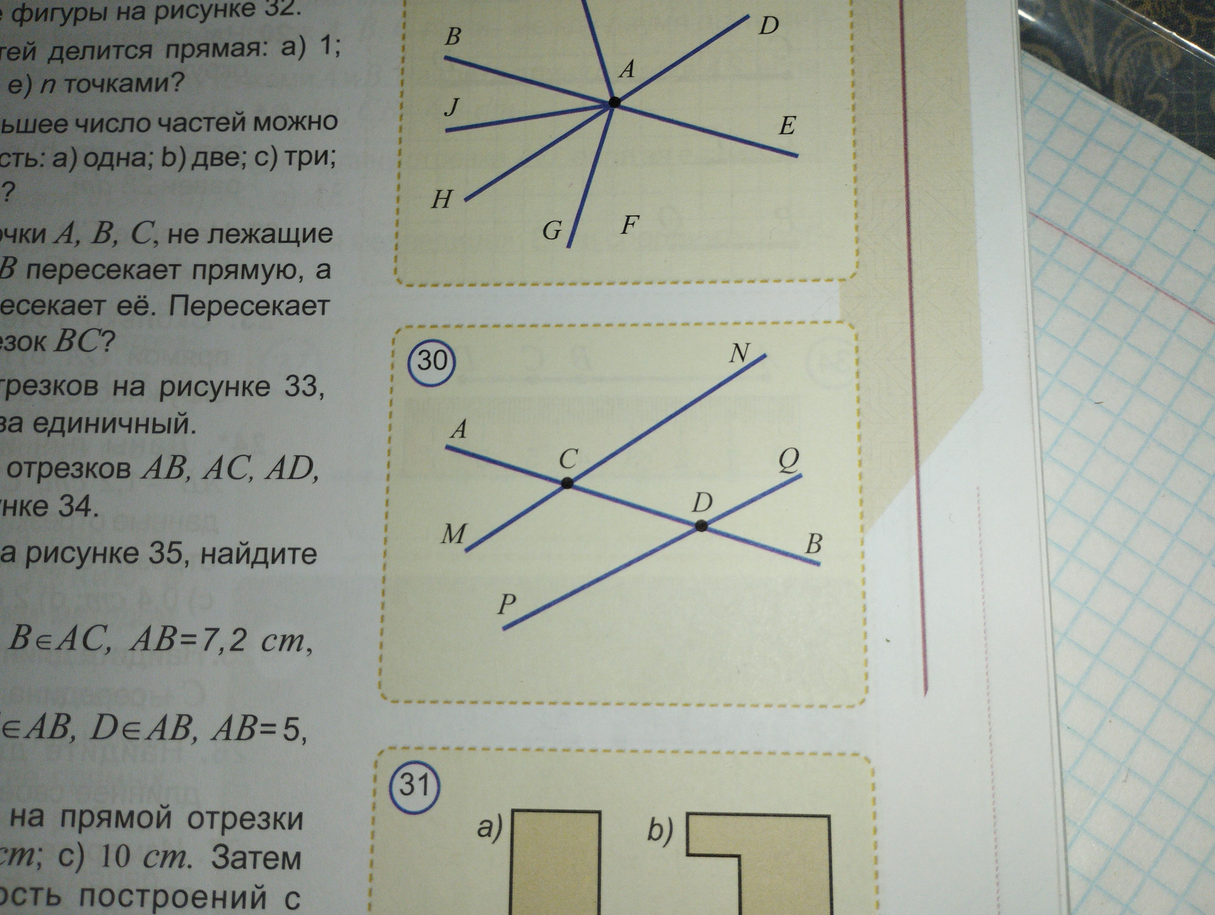 На рисунке 30 прямая AB пересекает прямые MN и PQ соответственно в точках C и D. Напишите взаимно дополняющие друг друга лучи, исходящие: a) из точки C; b) из точки D (даю 40 баллов)