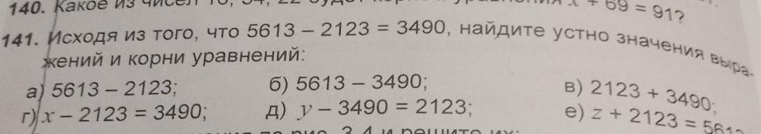 Исходя из того, что 5613-2123=3490, найдите устно значения выражений и корни уравнений а)5613-2123 б)5613-3490 в)2123+3490 г)x-2123=3490 д)y-3490=2123 е)z+2123=5613