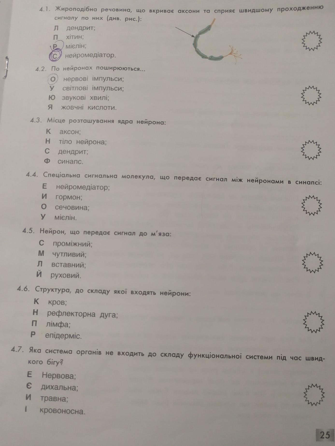 йся Упиши букви відповідей у зірочки. Склади із цих букв слово (5 б.). 4.1. Жироподiбна речовина, що вкриває аксони та сприяє швидшому проходженню сигналу по них (див. рис.): дендрит; хітин; мієлін; нейромедіатор. 4.2. По нейронах поширюються... нервові імпульси; світлові імпульси; Ю ЗВукові хвилі; я жовчні кислоти. 4.3. Місце розташування ядра нейрона: K аксон; Н тіло нейрона; с дендрит; Синапс. 4.4. Спеціальна сигнальна молекула, що передає сигнал між нейронами в синапсі: E нейромедіатор; и О У мієлін. гормон; сечовина; 4.5. Нейрон, що передає сигнал до м'яза: С проміжний; м чутливий; Л вставний; Й РУХОВИЙ. 4.6. Структура, до складу якої входять нейрони: K кров; H рефлекторна дуга; П лімфа; P епідерміс. ( 4.7. Яка система органів не входить до складу функціональної системи під час швид кого бігу? E Нервова; Є дихальна; И травна; I кровоносна.