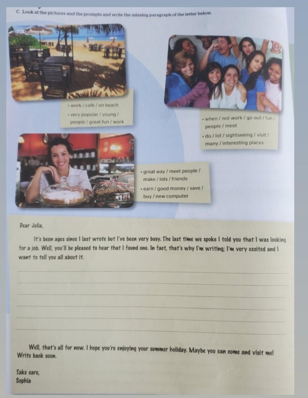 Look at the pictures and the prompts and write the missing paragraph of the letter bellow