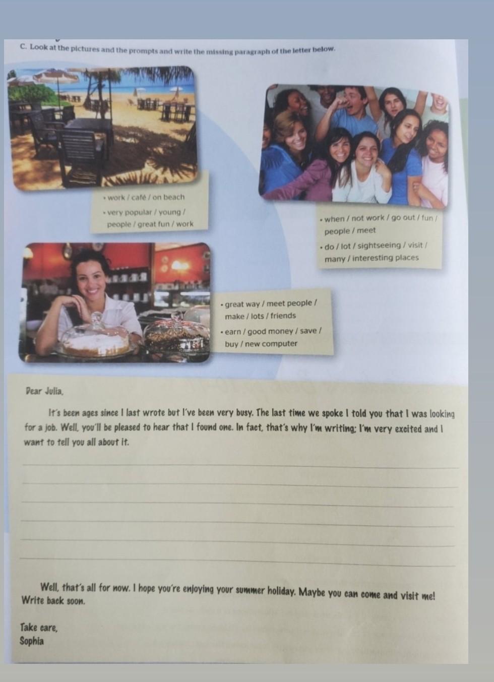 Look at the pictures and the prompts and write the missing paragraph of the letter bellow