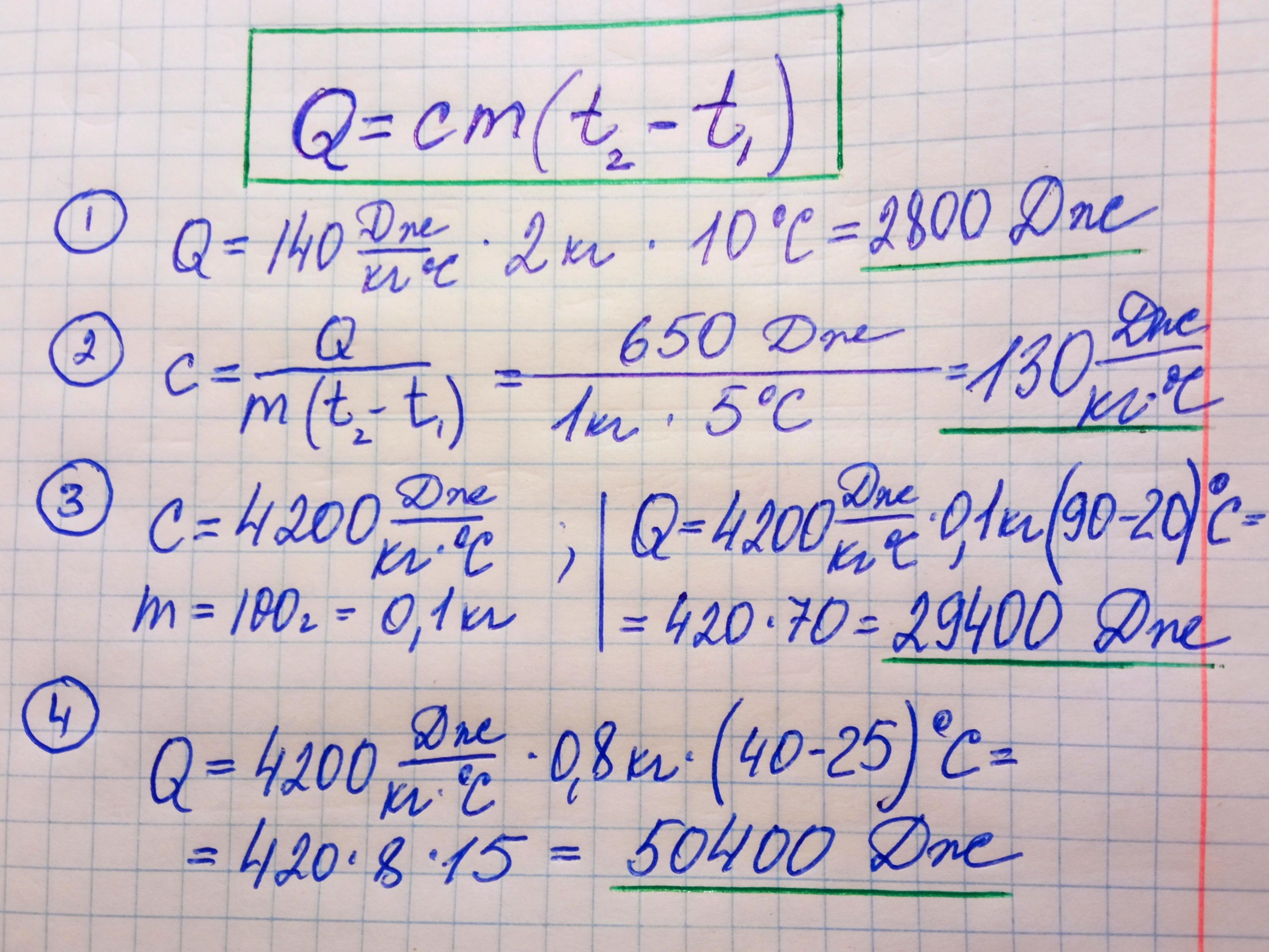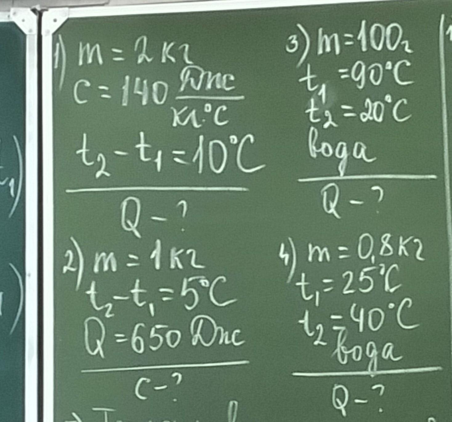 m = 2 кг C = 140 Dne M°C +2 t₂-t₁=10°C boga вода Q-? 2) m = m = 1k2 t₂-t₁=5°C Q = 650 Dnc (-² 3) m = 100₂ t₁ = 90°℃ t'₁₂ = 20°C d Tox Q-? 3)= 0,8K2 m= t₁ = 25C 1₂ = 40°C 12 вода Q-? C