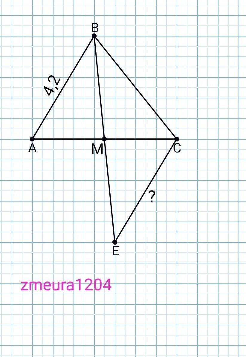 відомо що точка М-середина AC трикутника ABC, На промені BM позатрикутником відкладено відрізок ЕМ, який дорівнює відрізку ВМ. Знайдіть ЕС якщо АВ= 4,2см
