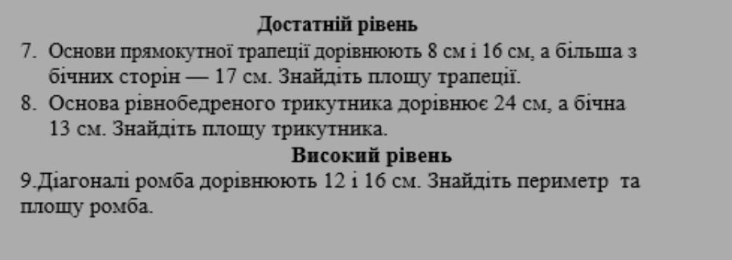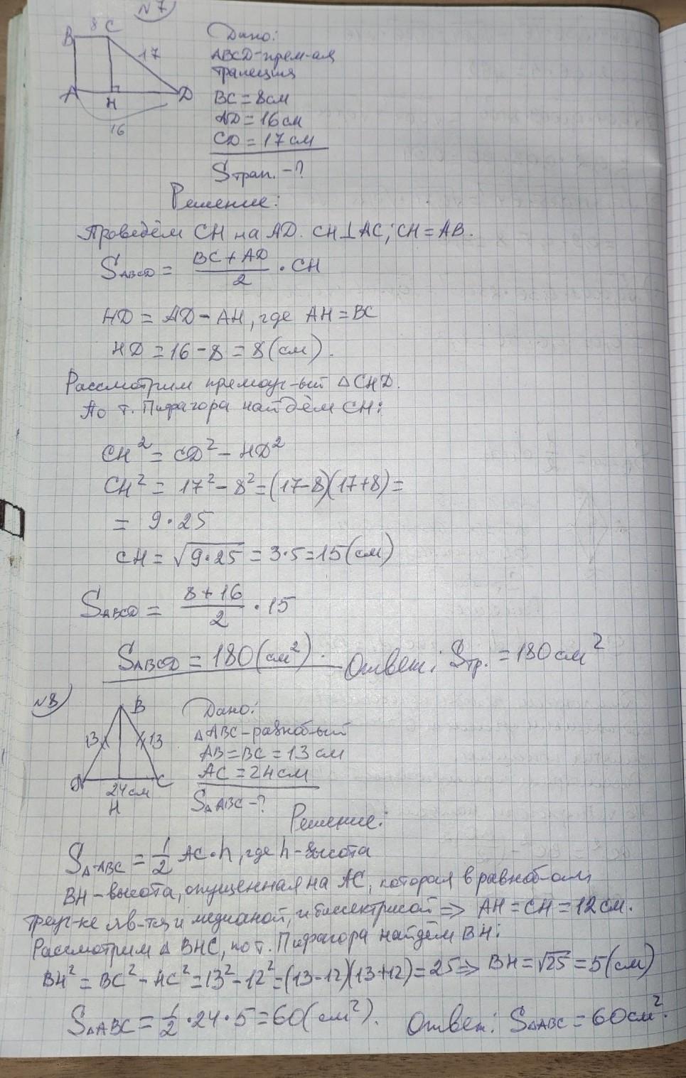7) 16-8=8проекція бічної сторони на нижню основу Теорема Піфагора h=√(17²-8²)=15; S=15(8+16)/2=15*24/2=15*12=