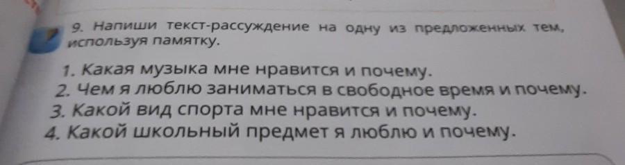 9. Напиши текст-рассуждение на одну из предложенных тем, используя памятку. 1. Какая музыка мне нравится и почему. 2. Чем я люблю заниматься в свободное время и почему. 3. Какой вид спорта мне нравится и почему. 4. Какой школьный предмет я люблю и почему.