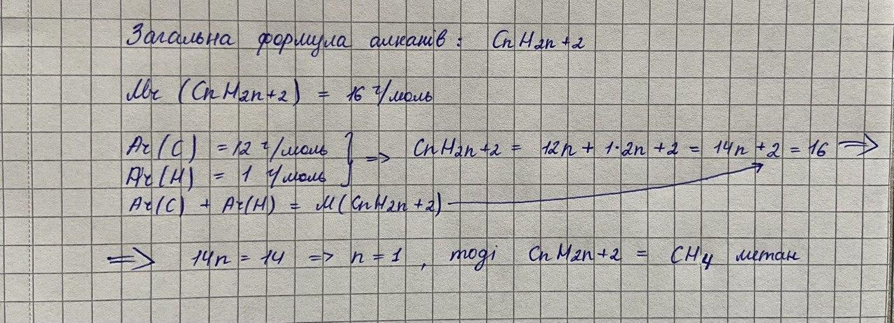 Сполука належить до гомологічного ряду метану. Запиши її хімічну формулу, якщо молярна маса — 16 г/моль.