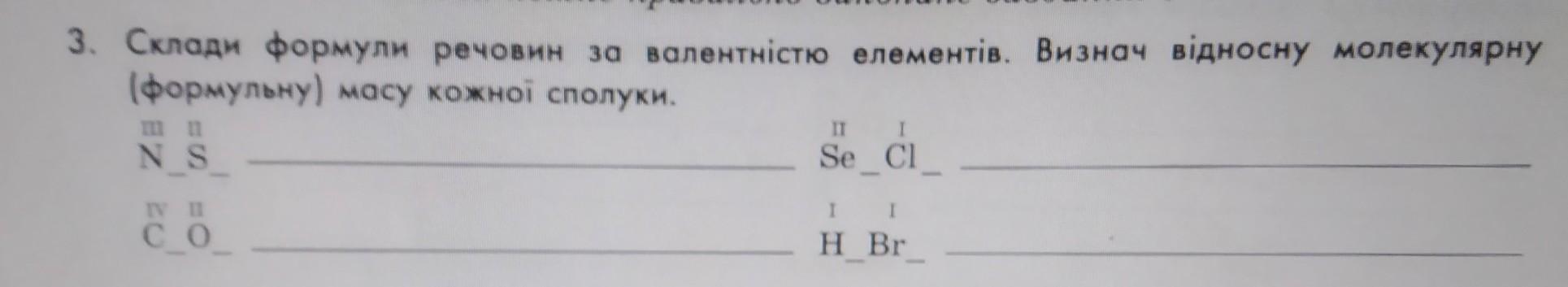 3. Склади формули речовин за валентністю елементів. Визнач відносну молекулярну (формульну) масу кожноï сполуки.