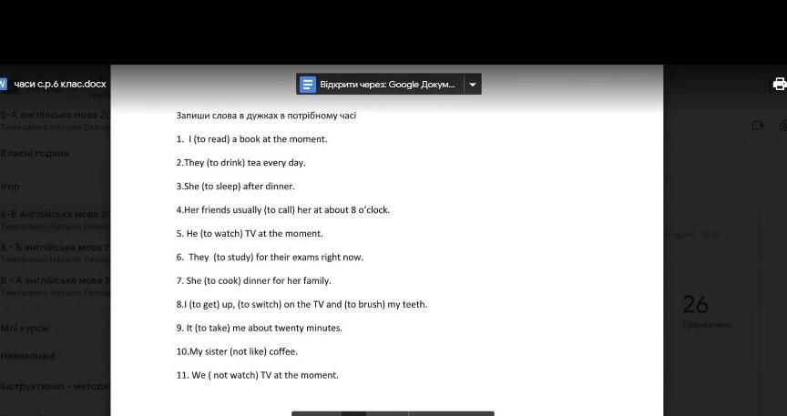 Запиши слова в дужках в потрiбному часі 1. 1 (to read) a book at the moment. 2.They (to drink) tea every day. 3.She (to sleep) after dinner. 4.Her friends usually (to call) her at about 8 o'clock. 5. He (to watch) TV at the moment. 6. They (to study) for their exams right now. 7. She (to cook) dinner for her family. 8.1 (to get) up, (to switch) on the TV and (to brush) my teeth. 9. It (to take) me about twenty minutes. 10.My sister (not like) coffee. 11. We (not watch) TV at the moment.