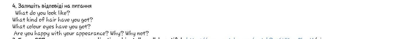 4. Запишіть вiдповiдi на питання What do you look like? What kind of hair have you got? What colour eyes have you got? Are you happy with your appearance? Why? Why not?