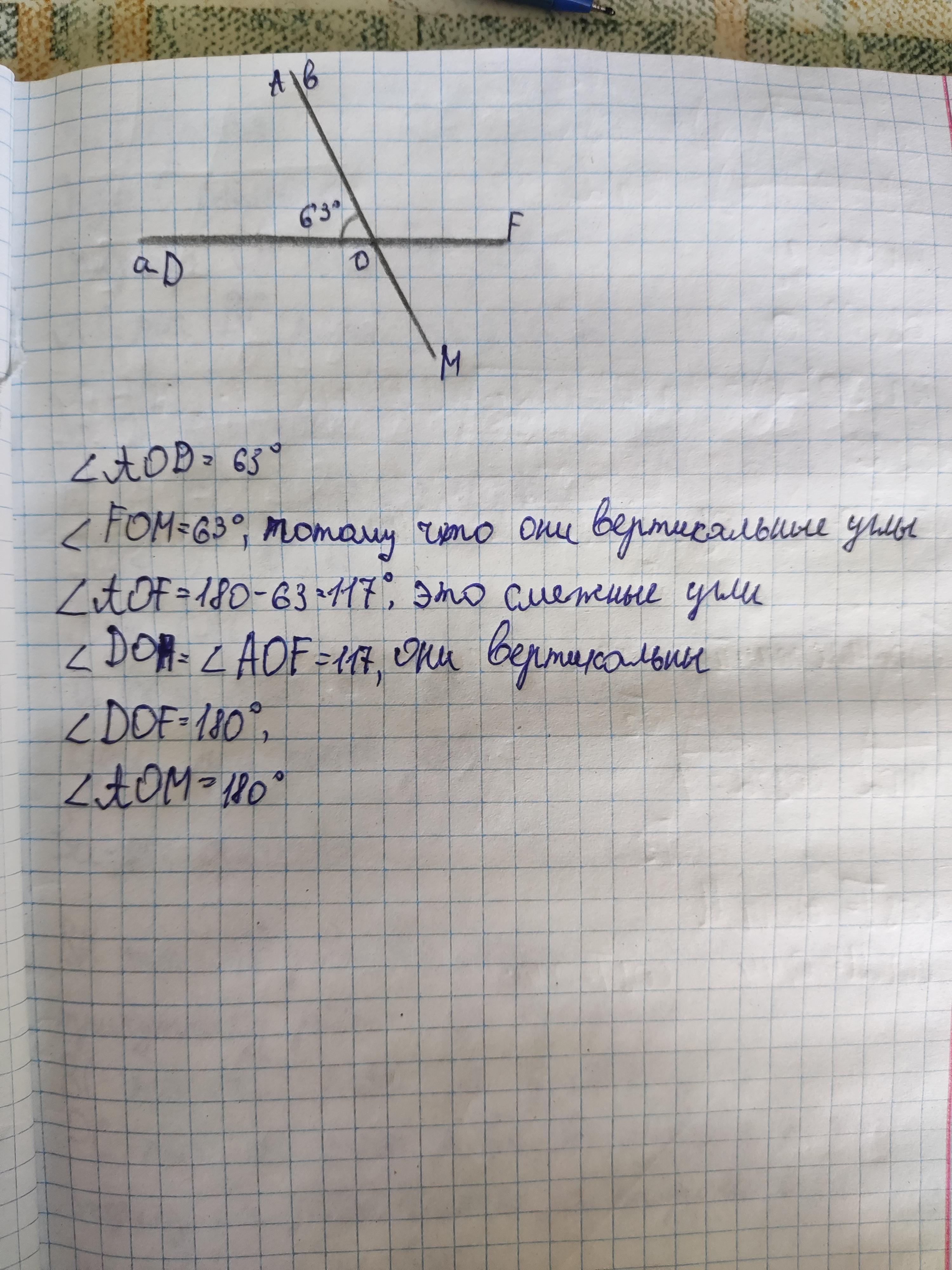Один из углов, образованных При пересесчении двух примых, равен 63°. Найдите градус шеры остальных углов. с черчением