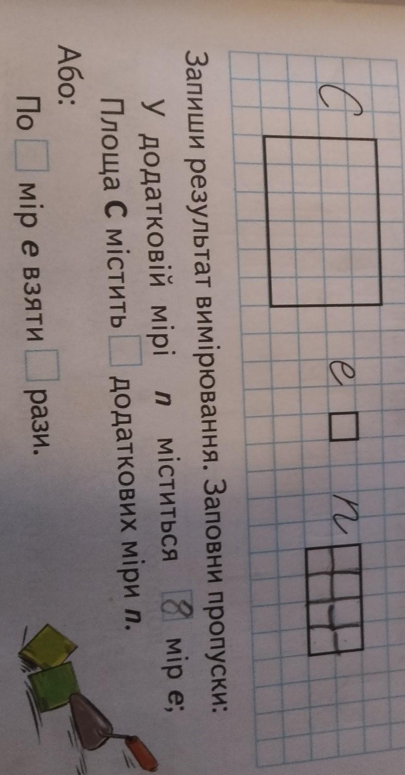 31. Виміряй величину С мірою е. Як додаткову міру візь- ми міру п. C Або: еп Запиши результат вимірювання. Заповни пропуски: У додатковій мірі n міститься 8 мip e; Площа С містить додаткових міри п. По мiр е взяти n рази.