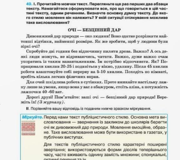 48.1. Прочитайте мовчки текст. Перегляньте ще раз перших два абзаци тексту. Намагайтеся сформулювати все, про що говориться в цій час- тинi тексту, одним реченням. Визначте основну думку тексту. До яко- го стилю мовлення вiн належить? У якій ситуації спілкування можливе таке висловлювання? ОЧІ - БЕЗЦІННий дар Дивовижний дар природи - околюдини! Воно здатне розрізняти най- тоншi вiдтінки, найменшi розміри. Як же зробити, щоб у людини були зiркi очі? Спробуйте дні години без відпочинку пиляти дрова. Важко? А ось де- які люди можуть, не вiдриваючись, читати. Важко, дуже важко очам упоратись із таким навантаженням. Їм потрібно відпочивати. Як? По- працювали хвилин 20-25 i подивіться у вiкно, удалину. Після 45 хвилин роботи влаштовуйте собі перерву на 5-10 хвилин. Походіть по кімнаті, аробiть кiлька легких фiзичних вправ. Для очей шкідлива робота в сутінках. Проте вмикайте настільну лам- пу лише за умови, якщо вона у вас з абажуром, стоïть злiва, а потужність лампочки 40-60 ват. Дорогі друзil Пам'ятайте: наші очі - безцінний дар природи! Бере- жiть їх! (3 журналу). II. Порівняйте вашу вiдповiдь із поданим нижче зразком міркування. Мiркуйте. Перед нами текст публіцистичного стилю. Основна мета ви- словлювання - звернення із закликом до школярів берегти очі як дивовижний дар природи. Мовлення емоцiйне, образ- не. Таке висловлювання може бути використане в газетах, у публiчних виступах. Для текстів публіцистичного стилю характернi поширені звертання; використовуються форми дiсслiв теперішнього часу, часто вживають однину замість множини; спонукальні, oynuyul Deveug Ta iu.