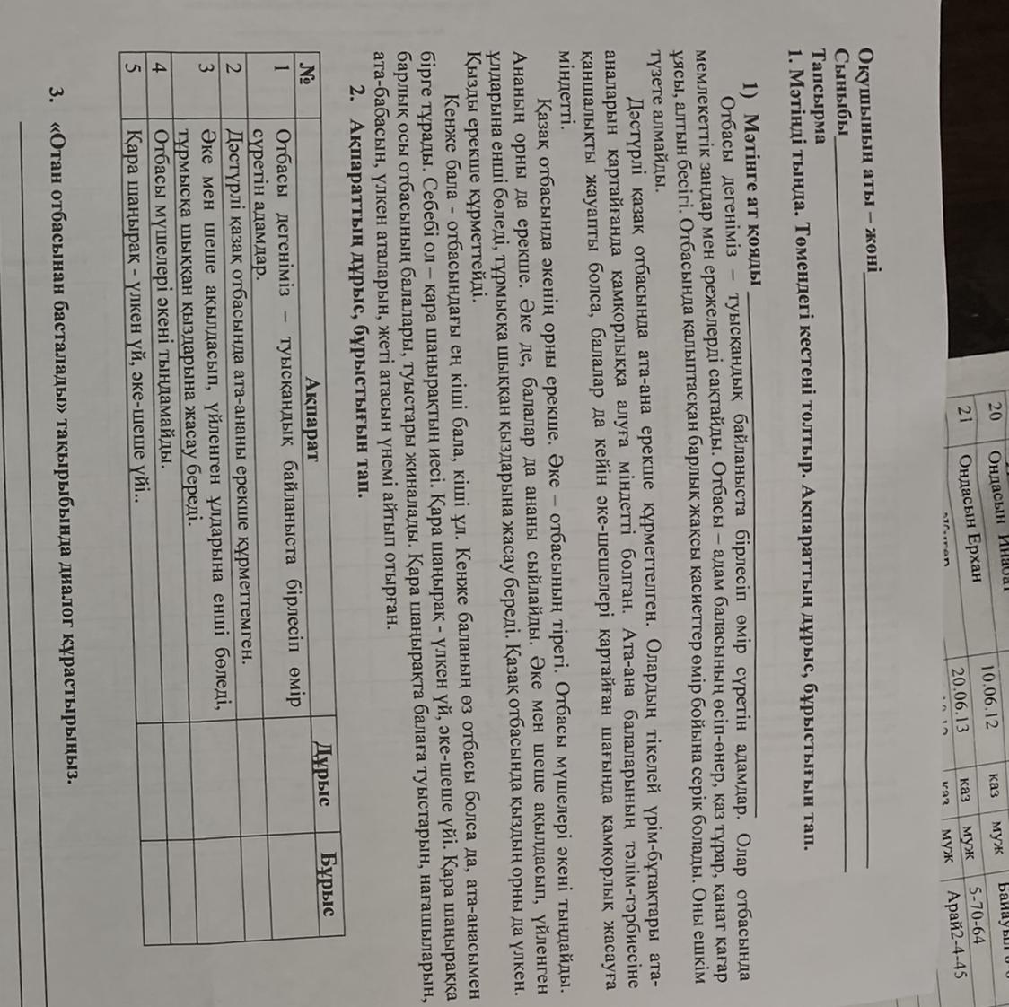 1. Мәтінді тында. Төмендегі кестені толтыр. Ақпараттың дұрыс, бұрыстығын тап.