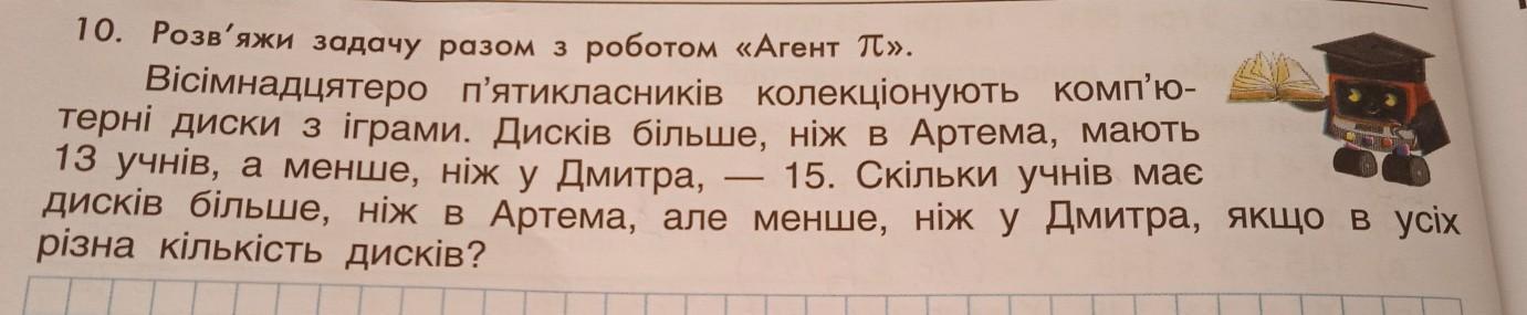 вісімнадцятеро п'ятикласників колекціонують комп'ютерні диски з іграми. дисків більше, ніж в Артема, мають 13 учнів, а менше ніж у Дмитра,—15. скільки учнів має дисків більше, ніж в Артема, але менше, ніж у Дмитра, якщо в усіх різна кількість дисків?