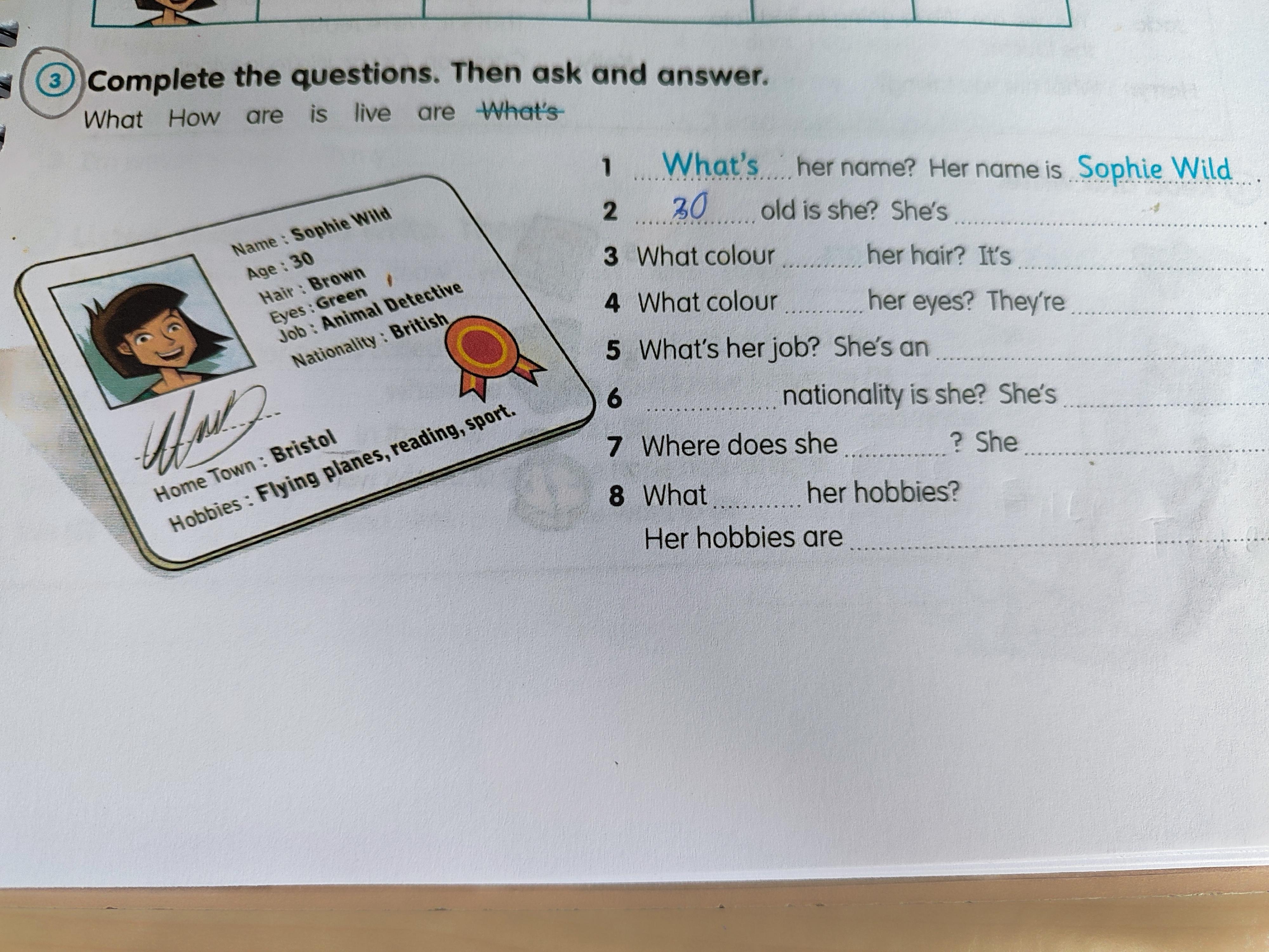3) What colour is her hair? It's brown.